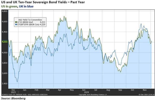 While US stocks have been celebrating the election of Donald Trump, the S&P 500 and the NASDAQ are both up by around 5% since 5th November, US bonds have not been so sure. Ten and thirty-year US Treasury yields moved up following the result, worrying about those inflationary policies (tariffs!) and the yawning budget deficit. But they have since re-traced the move on the back of reasonably encouraging inflation data and soothing commentary from Fed speakers. UK ten-year Gilt yields have moved increasingly in lockstep with US yields (see right). In Europe, yields are generally lower, the German ten-year bund yield is close to 2%, but French yields are struggling. The French ten-year yield at 2.9% is the same as Greece (that is quite a turnaround in fortunes) and higher than the Spanish and Portuguese equivalent.