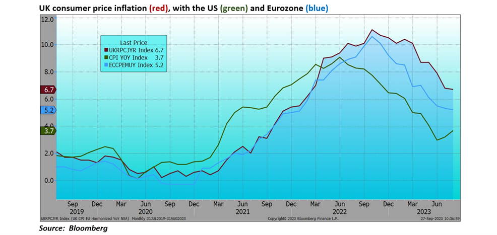 Of course, it is still all about inflation, and it was good to see the UK coming back into line rather more than it was, notably in the ‘core’ rate, which undershot quite markedly. Below is the unfolding picture for the CPI, noting that markets are nervously watching the oil price, which has moved up from around $75 in May/June to $95 today, squeezed higher by supply reductions from Saudi Arabia and Russia.