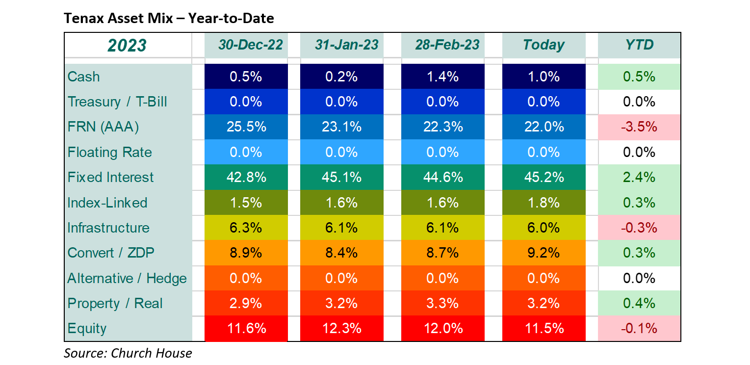 The overall pattern of changes is similar to the end of last year with a gradual reduction in floating rate notes and shift to fixed interest following the much more attractive returns now on offer. We still prefer the short-dated end of the fixed interest market, not seeing adequate compensation for the higher risk in longer dated instruments. We have also added to the convertible area and recently begun to re-establish some commodity exposure via Freeport-McMoRan (in the Property / Real area). Our holdings in UK bank equities have suffered over the past couple of weeks but now look to be seriously over-sold, we have also established a small initial position in Morgan Stanley.