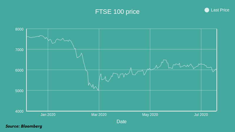 UK markets sold-off in July on the back of worries that we will see a second material wave of COVID-19 cases and a series of poor interim reports from index heavyweights, such as Royal Dutch Shell, Lloyds and HSBC (none of which we own). Rishi Sunak’s summer budget was taken well, initially, before being largely forgotten. I am not a chartist, but it is interesting to see that 6,000 has become a meaningful level that the FTSE 100 has been struggling to hold since the market rally petered-out in June (see chart, right).