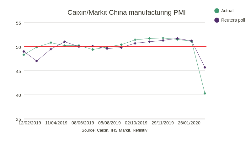 The negative economic effect of the coronavirus is clear to see in cancelled events, empty airports and closed factories. The Caixin/Markit China Manufacturing PMI numbers released earlier this week paint a bleak picture, with a reading of 40.3 – the lowest ever recorded (see chart, right). A reading above 50 indicates expansion, while below 50 indicates contraction.