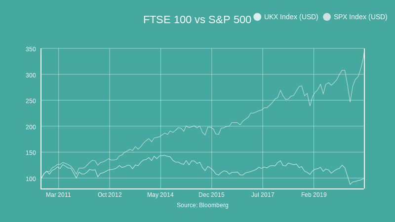 The graph, see right, highlights the ever widening gap between the FTSE 100 and the S&P 500 over 10 years, with the US making regular new all-time highs (a sharp V shaped recovery) whilst the UK is still around 13% off its all-time high.